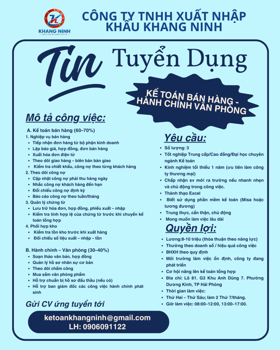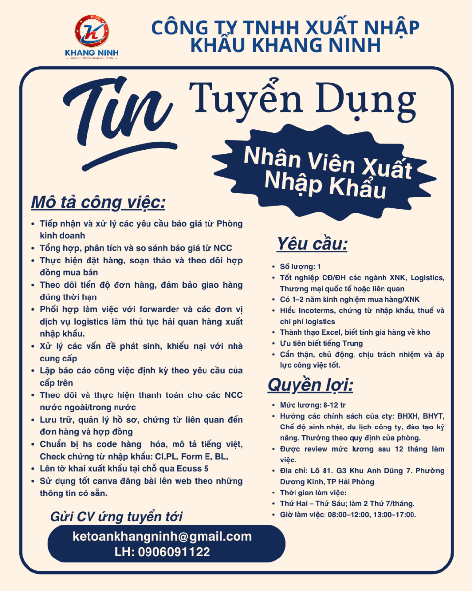 [HẢI PHÒNG] CÔNG TY TNHH XNK KHANG NINH